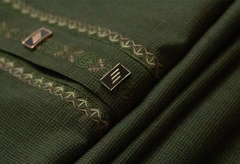 Intricate embroidery on the collar and cuffs, finished with contrast maroon-toned borders for a touch of sophistication. Elegant metallic buttons with logo engraving add luxury to the overall look.