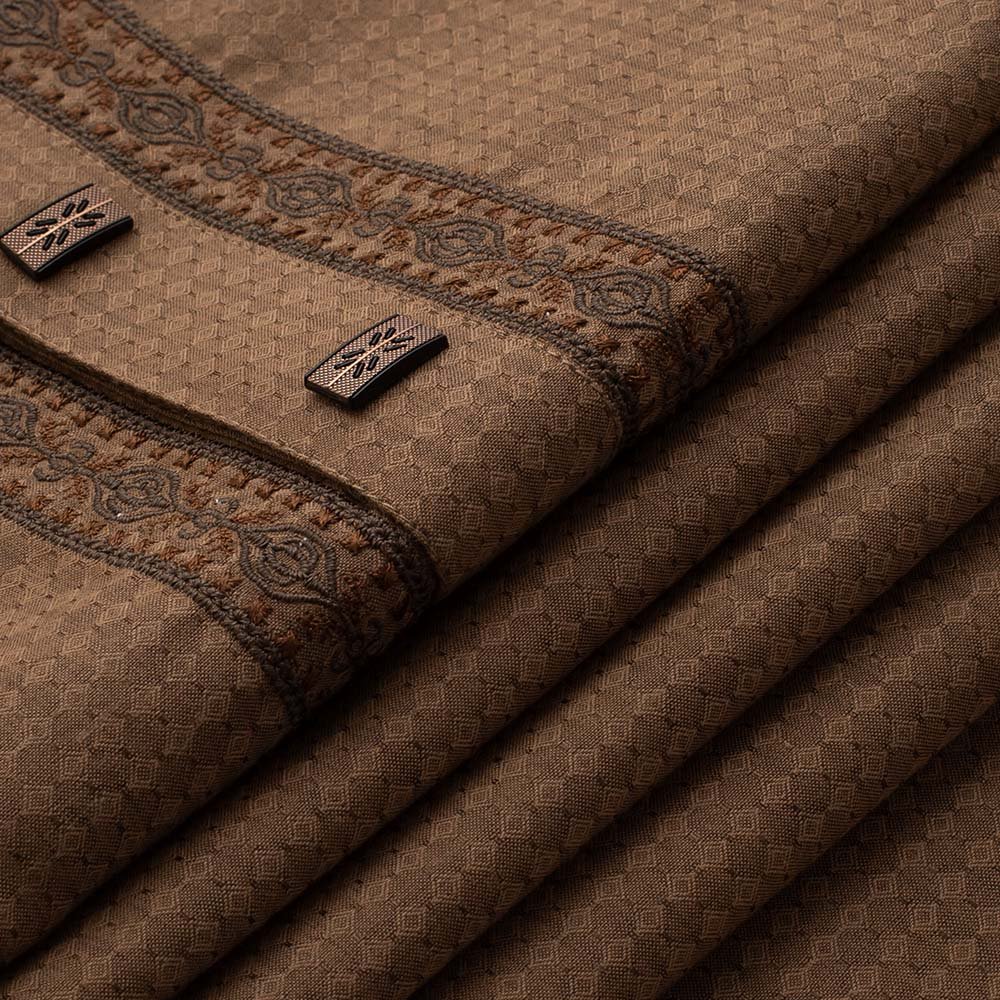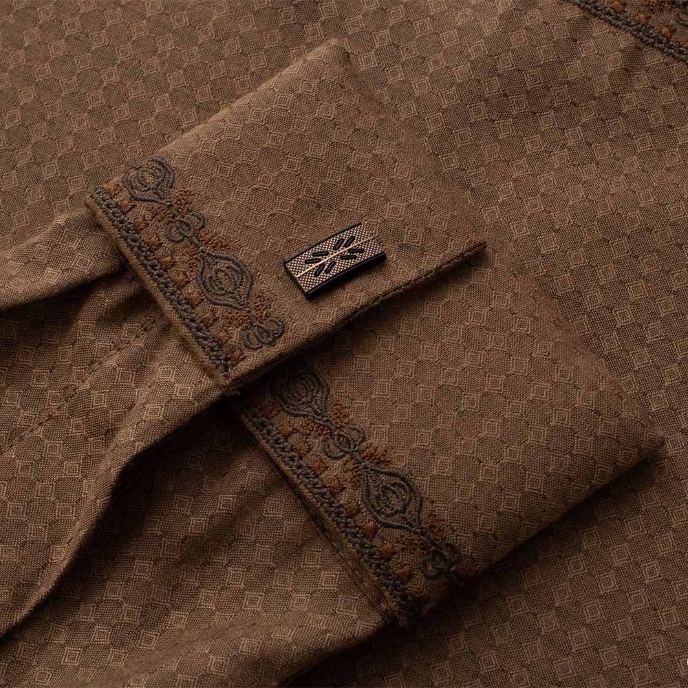 Intricate embroidery on the collar and cuffs, finished with contrast maroon-toned borders for a touch of sophistication. Elegant metallic buttons with logo engraving add luxury to the overall look.