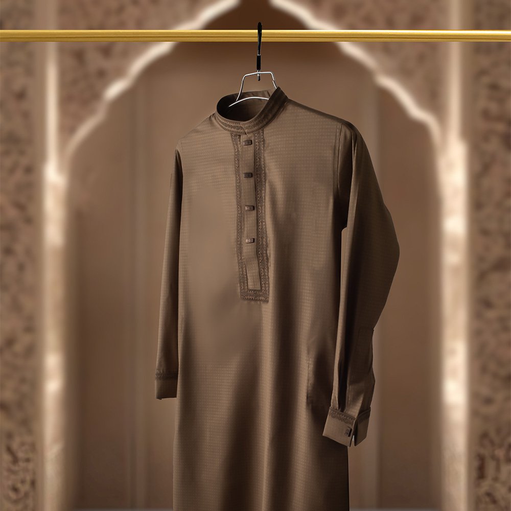 Keep your AMBER Panjabi in a cool, dry place. Use a breathable garment bag to protect it from dust. Avoid folding it in ways that might create hard creases.