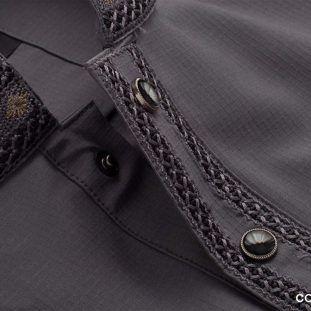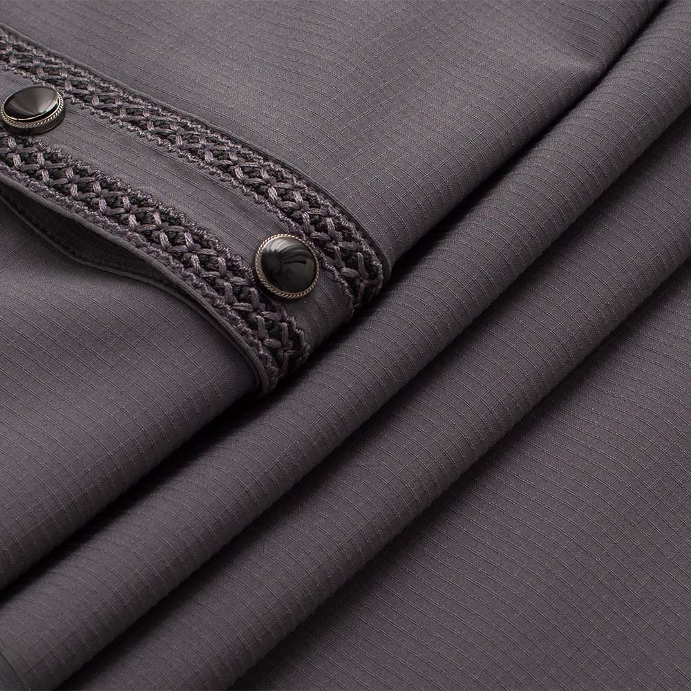 Intricate embroidery on the collar and cuffs, finished with contrast maroon-toned borders for a touch of sophistication. Elegant metallic buttons with logo engraving add luxury to the overall look.