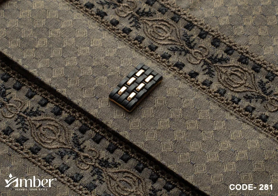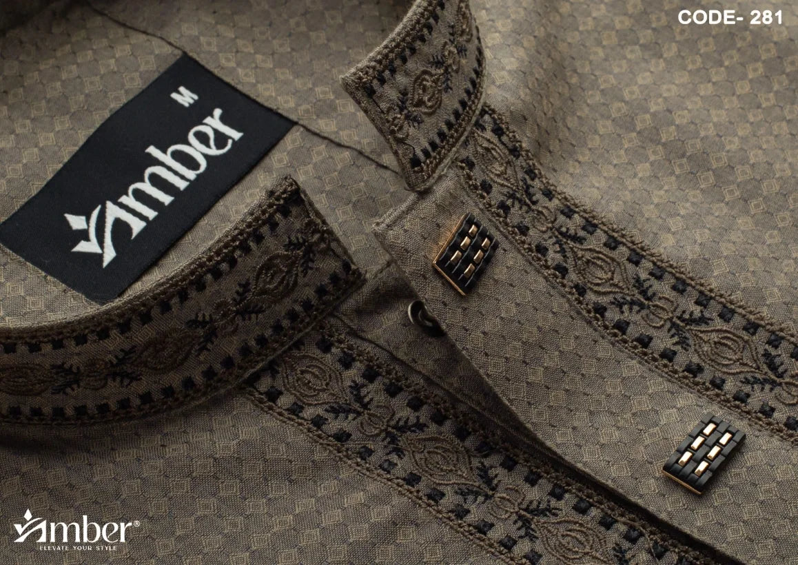 Featuring refined embroidery on the collar and cuffs, accented with contrast maroon-toned borders for a sophisticated finish. Complemented by signature metallic buttons engraved with the Amber logo for a luxurious touch.