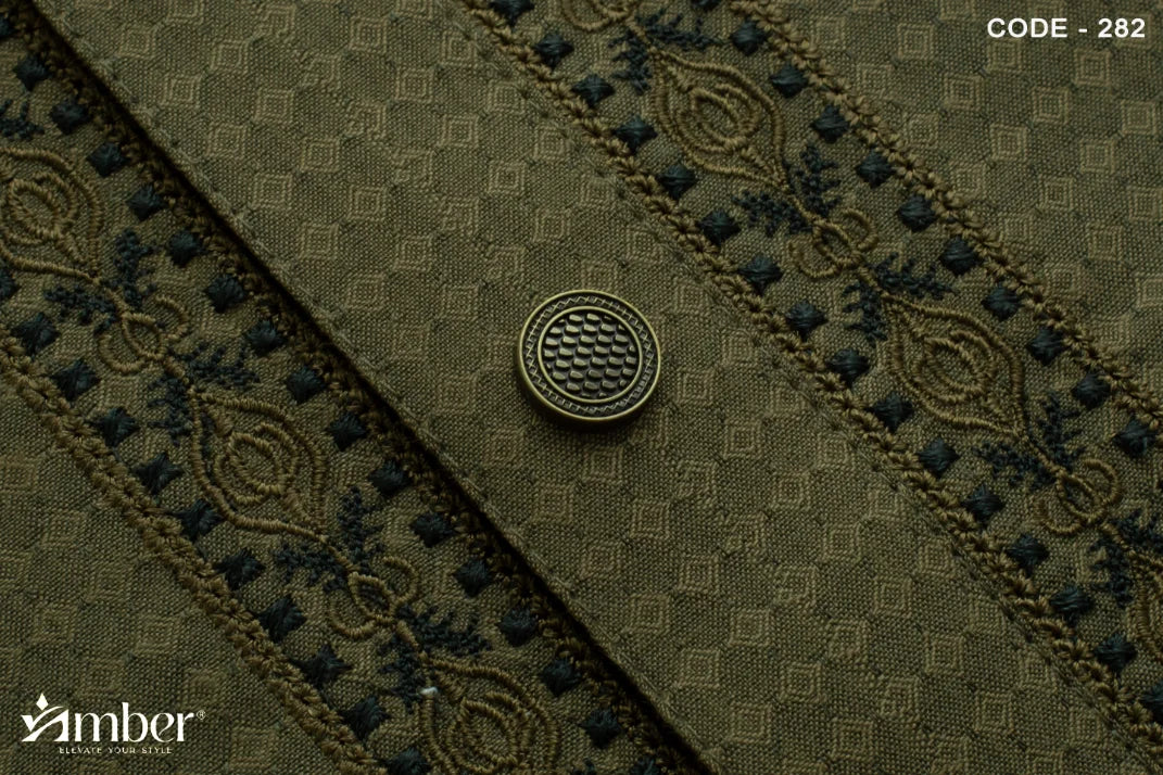 Featuring refined embroidery on the collar and cuffs, accented with contrast maroon-toned borders for a sophisticated finish. Complemented by signature metallic buttons engraved with the Amber logo for a luxurious touch.