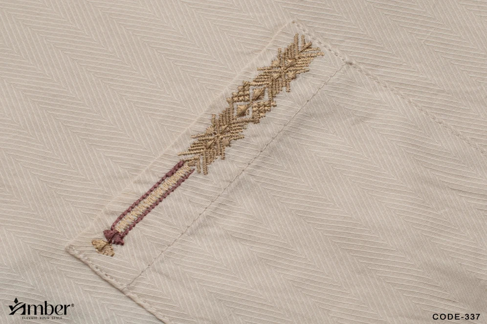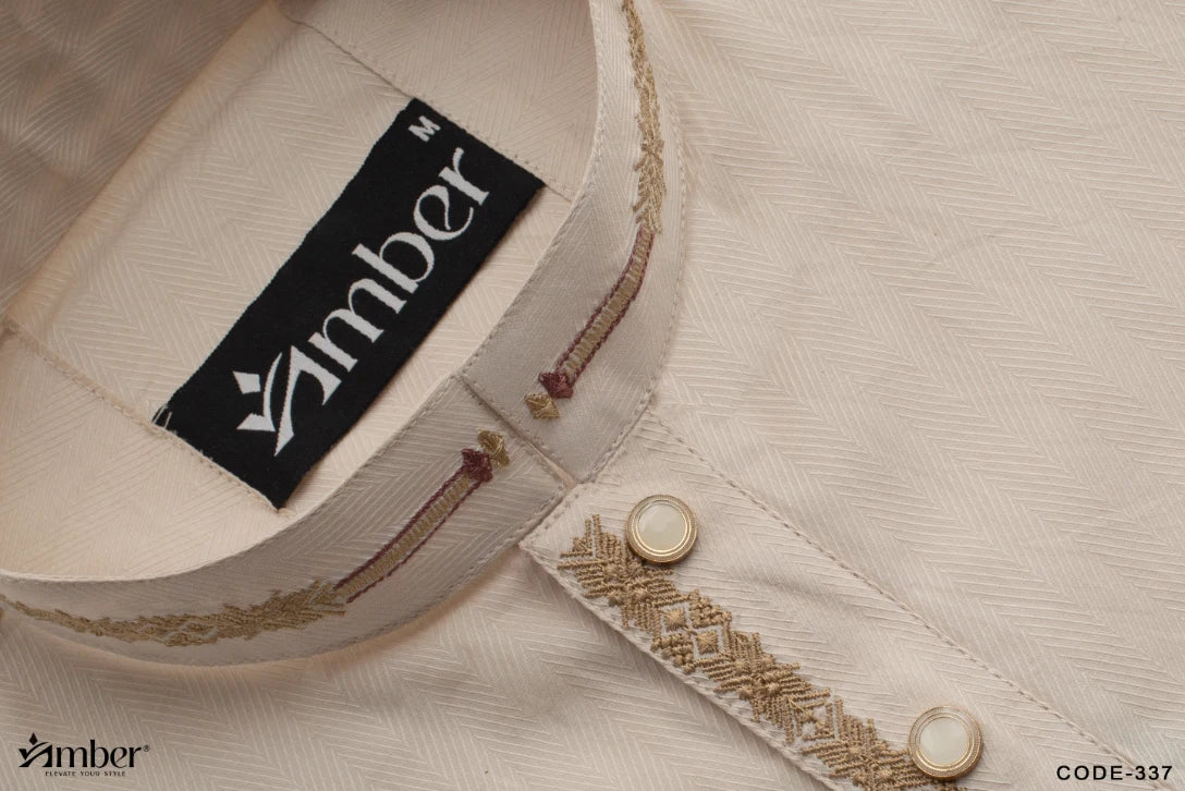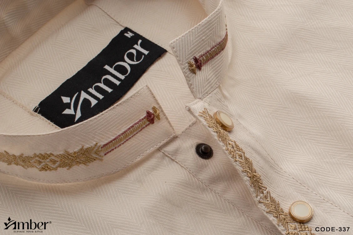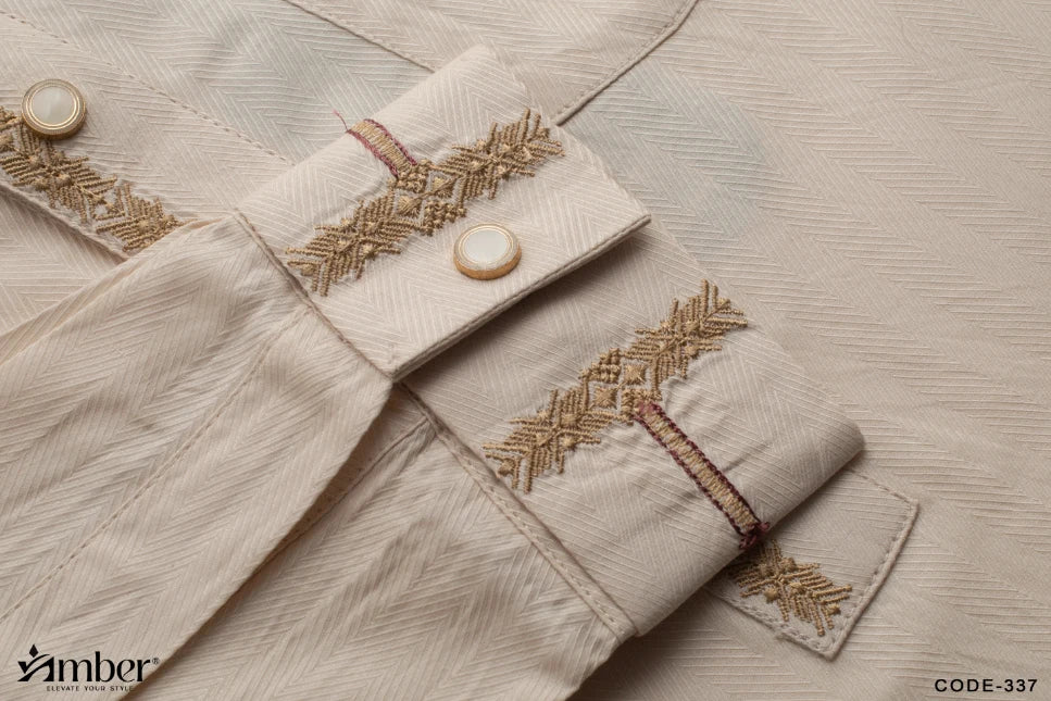 Featuring refined embroidery on the collar and cuffs, accented with contrast maroon-toned borders for a sophisticated finish. Complemented by signature metallic buttons engraved with the Amber logo for a luxurious touch.