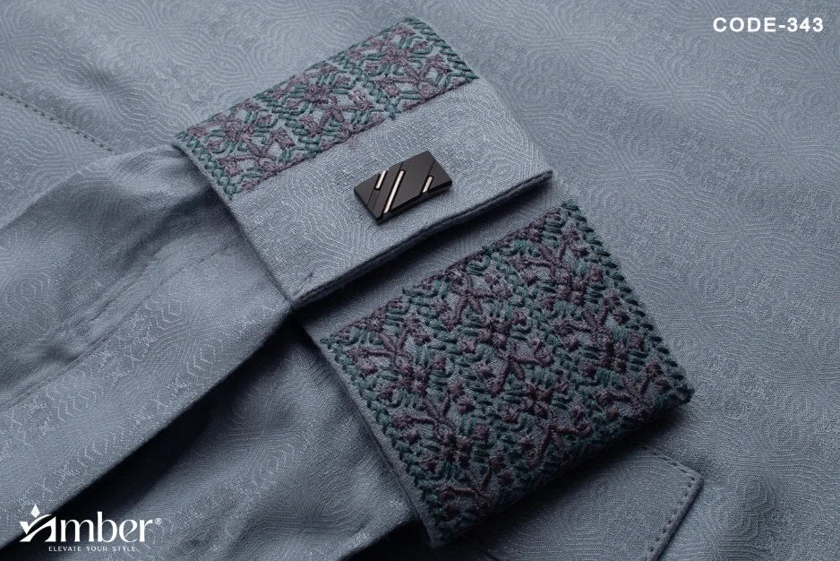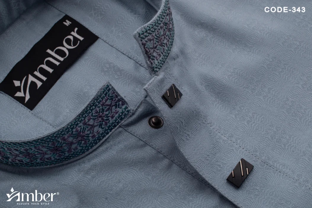 Featuring refined embroidery on the collar and cuffs, accented with contrast maroon-toned borders for a sophisticated finish. Complemented by signature metallic buttons engraved with the Amber logo for a luxurious touch.