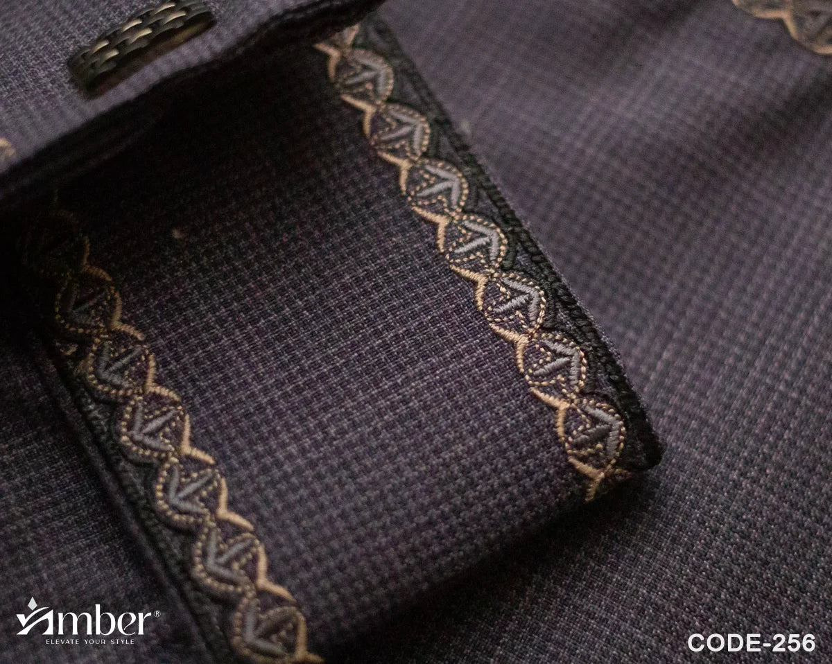 Intricate embroidery on the collar and cuffs, finished with contrast maroon-toned borders for a touch of sophistication. Elegant metallic buttons with logo engraving add luxury to the overall look.