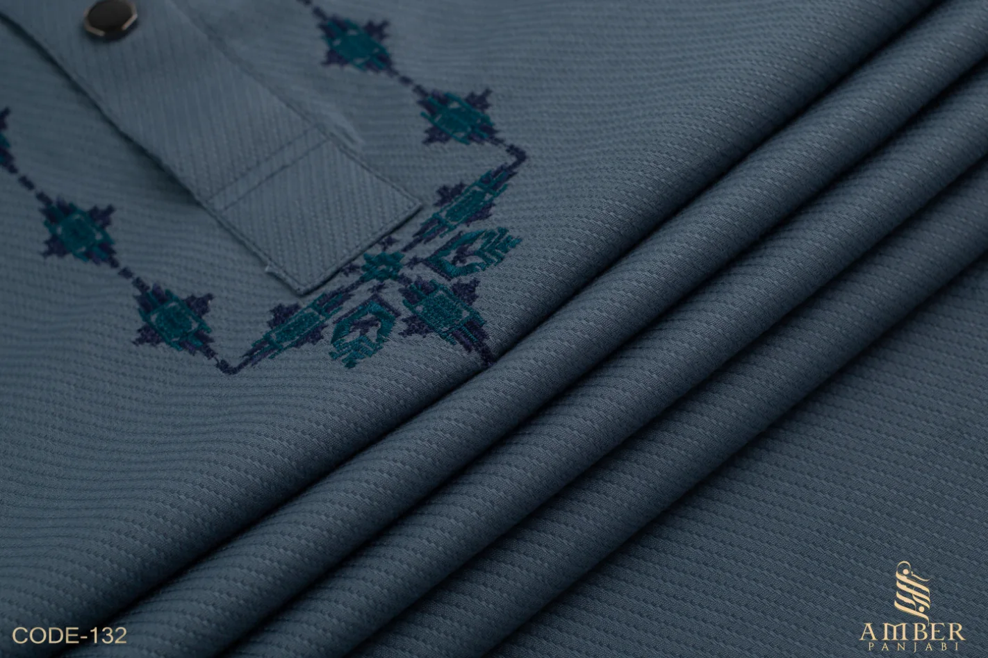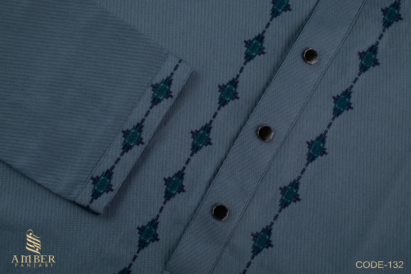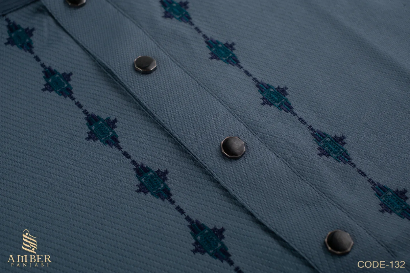 Intricate embroidery on the collar and cuffs, finished with contrast maroon-toned borders for a touch of sophistication. Elegant metallic buttons with logo engraving add luxury to the overall look.