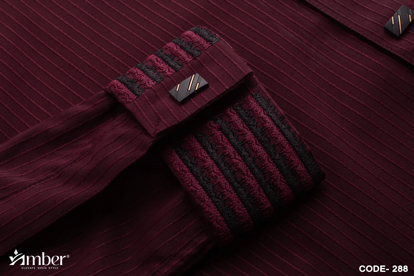 Intricate embroidery on the collar and cuffs, finished with contrast maroon-toned borders for a touch of sophistication. Elegant metallic buttons with logo engraving add luxury to the overall look.