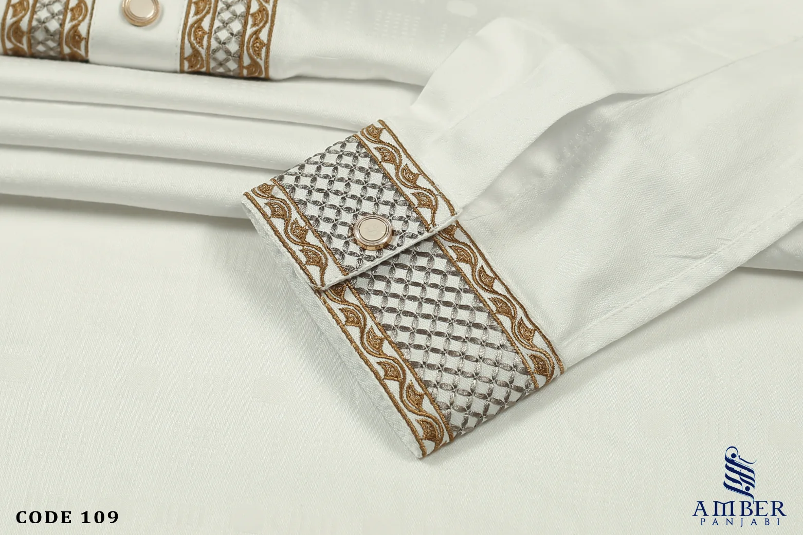 Intricate embroidery on the collar and cuffs, finished with contrast maroon-toned borders for a touch of sophistication. Elegant metallic buttons with logo engraving add luxury to the overall look.